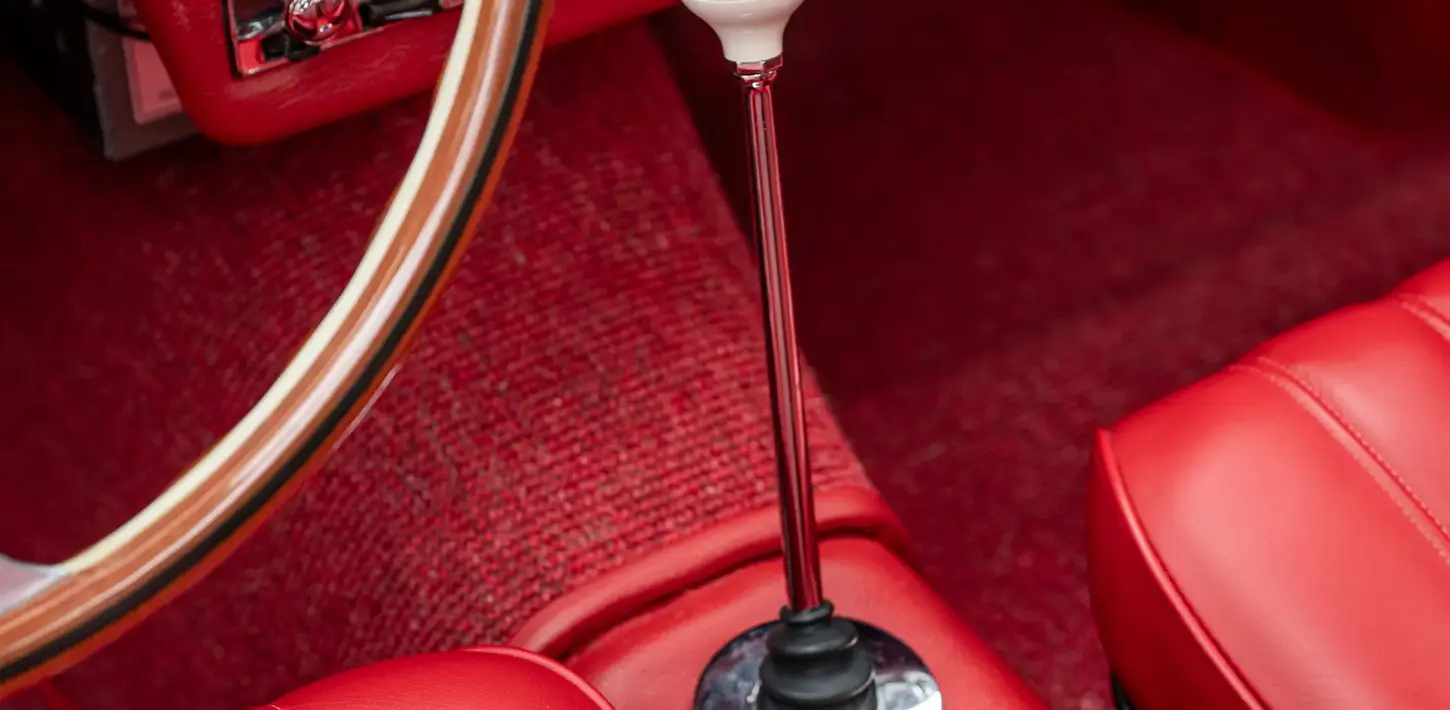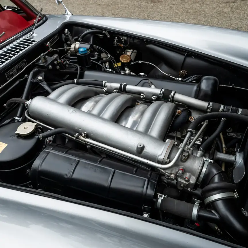 Refinished in iconic color scheme of Silver Metallic (DB 180) over red leather (1079)
