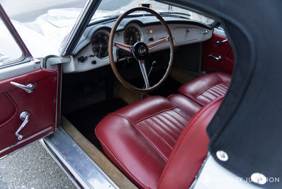 Today this beautiful Lancia B24S presents as an authentic combination of long-term care and thoughtfully restrained restoration. The body and paint, refinished to a high level several years ago, remain very nice throughout with excellent coverage, displaying a smooth and glossy finish, showing only minor road chips indicative of the current and prior owner’s joy using the car as intended. Chrome finishes are excellent and, while some aspects of the restoration have settled over time, the car has uniformly mellowed to a very satisfying presentation. The finishes and exterior details have been executed with a high level of craftsmanship including very nice body panel gaps and excellent closures. A set of Marchal road lamps are mounted to the front bumper, adding to the performance nature of these cars. The car sits on correct Michelin X 165R400 radials, one of the first production cars to offer radial tires as standard equipment. The wheels are properly finished with beautifully polished trim rings and wheel covers bearing the embossed Lancia name. The curved single piece windshield is clear and unmarked, while the side glass (still retaining date coded Sekurit etching) raises and lowers smoothly, and the vent windows pivot out properly. The gorgeous black canvas convertible top was professionally restored in March 2022 using correct high-quality canvas including a sewn-in crystal-clear rear window.