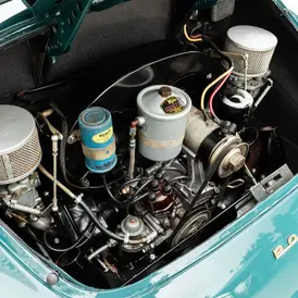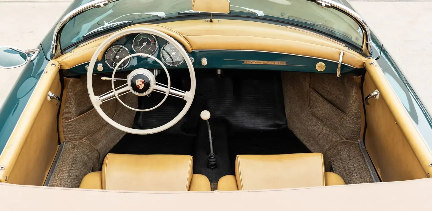 Delivered new to Hoffman Motors in New York, January 1, 1958 this Speedster quickly made its way to California where it remained with a long-term owner in very original condition. At some point in its life it received a re-paint to red over the original Fjord Green paint. In 2015, 84375 was discovered in static storage in a California with the front bumper removed. The overall condition was found to be very original throughout and a thorough mechanic service was performed to bring it back to roadworthiness. It was then sold to its next caretaker who performed a quality re-paint in its original 5705B Fjord Green color. In 2022 noted California Porsche service shop Markham Motor Works performed a major service in preparation for a CA Highway 1 adventure. Records from 2021-2022 total approximately $15,000.00.