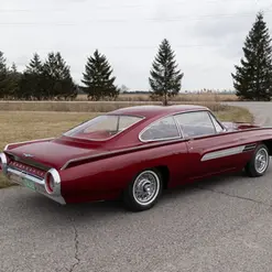 Construction began with a brand-new 1962 Thunderbird convertible, shipped directly from the factory to DST’s facility. There, under the direction of the highly talented Vince Gardner, it underwent a transformation that included a sleek fastback roofline, drawn at Ford Styling and molded at DST from a customizer’s favorite material, fiberglass. DST added 1963 Thunderbird front fenders and doors, reshaped the rear fender openings around the wheels, and installed some 80 custom trim pieces, including a Ferrari-inspired egg-crate grille that partially concealed the turn signals, a chrome-plated hood molding, side vents blended into engine-turned metal flourishes on the flanks, and an interior with faired-in rear seat headrests, chrome-plated moldings, and extensive use of leather, even on the headliner and rear package tray. All of it was topped off with a bright paint job in candy apple red, of a deep, almost wet luster familiar to any Autorama-goer of the time.