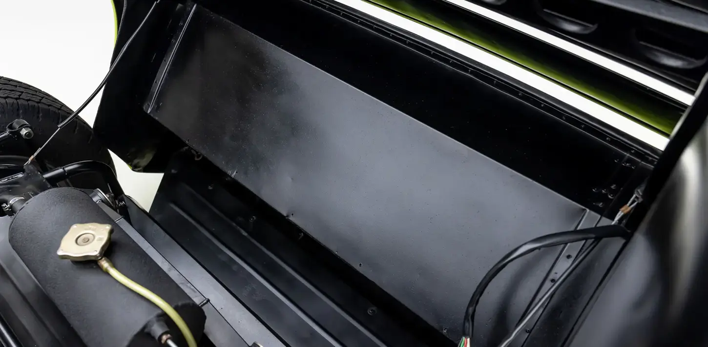 In 2017 the Lamborghini was treated to a refinish in the dazzling original color scheme of Giallo Miura over a Bleu interior, as currently presented. Mechanical service in the ensuing years is reported to have included installing a 100-amp alternator and other work on the electrical system in 2018; rebuilding the triple-choke Weber 40 IDL 3C carburetors in 2020; and replacing the starter crown gear in 2021 and the clutch slave cylinder and muffler in 2023. In January 2026, work by specialists Fast Cars Ltd. in Redondo Beach, California, included servicing the distributor, as indicated by an invoice on file.