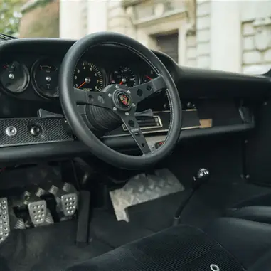 Swing open the door and you are greeted by lightweight door cards- gone are the deviating materials and storage bin- all you have now is the window crank, a strap to open the door and a handle to close it. Moving inside and the seats are a pair of lightweight buckets with significant side bolstering- designed to keep you in place during the most aggressive driving- and seat centers finished in corduroy cloth with rivets in them for ventilation- much like those you would have seen in a 1968 911R. Milled aluminum pedals offer great grip on your shoes and a battery cutoff switch has been installed in the center of the dash. The rear seats have been deleted which both reduces weight but also makes for a truly spacious area for luggage behind the seats.