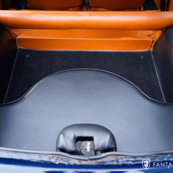 The color-contrasting interior is excellent overall. The clean black vinyl and wood dashboard are handsomely finished. The low-profile bucket seats are in excellent condition with good side bolsters and lower seat support. A small 1/8” hole is noted on the driver’s seat bottom bolster. The door panels, headliner, and wood dash trim are in very good condition. A properly housed clock and rare radio delete plate with Fulvia script finish the dashboard. The gauges and controls feature nice color and contrast, and excellent trim. The correct ribbed and fitted rubber floor mats are similarly nice as is the leather wrapped Lancia steering wheel. Lifting the rear hatch, the rear storage area is finished and trimmed with appropriate materials. Further, the rear hatch can be electronically raised and lowered from a dash switch, allowing cabin ventilation, a quintessentially Lancia feature that is both functional and clever.