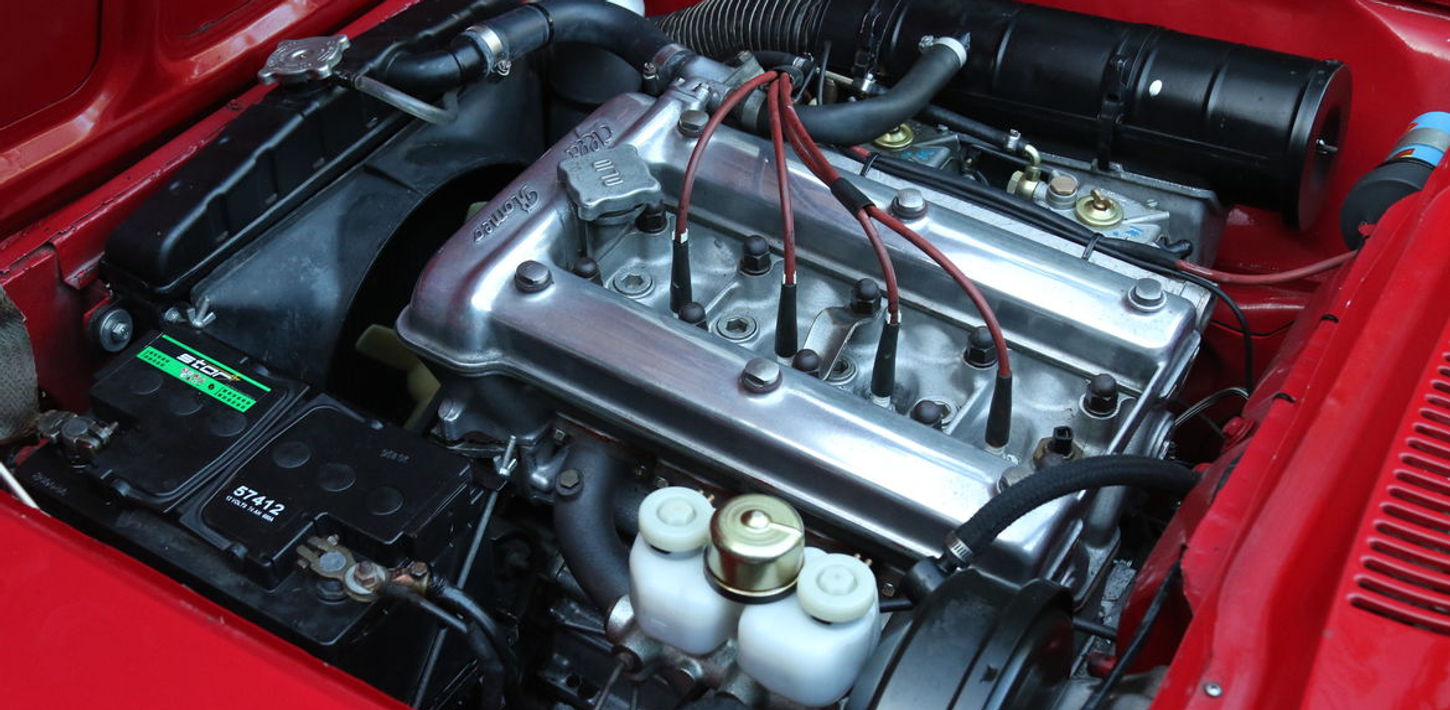 The interior has been comprehensively re-trimmed in a diamond-stitched pattern, and the upholstery is generally very nice. Aftermarket bucket seats have been installed in place of the less sporting stock units, and 4-point belts in red replace the originals. A trio of gauges have been added to the lower center console, and this is where the functioning oil pressure gauge can be observed. An aluminum shift knob replaces the black plastic piece which would have been fitted when new.