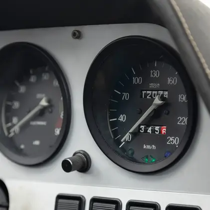 Its Azzurro Chiaro paint has stayed in good condition, with matching “397” body tags on its glass fibre panels and door hinges. This corresponds to Lancia factory records to the body no. 397, which left Bertone’s Grugliasco works on 21 October 1974, and was completed on 9 January 1975 for the Italian market. Inside, its black Alcantara seats have been kept well preserved, extending to the “Sereno” carpets, seat shells, and dashboard.