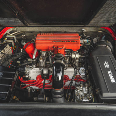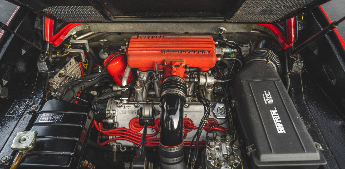 The mid-mounted 2.9L quad-cam V8 is equipped with four valves per cylinder, Bosch K-Jetronic fuel injection, and an aftermarket intake tube and exhaust system. The oil-pressure sending unit does not work, and the smog pump, air-injection tubes, and catalytic converter have been removed. Work performed in 2020 included rebuilding the water pump and replacing the fuel filter, spark plugs, camshaft seals, timing and engine-accessory belts, and distributor and valve cover gaskets.