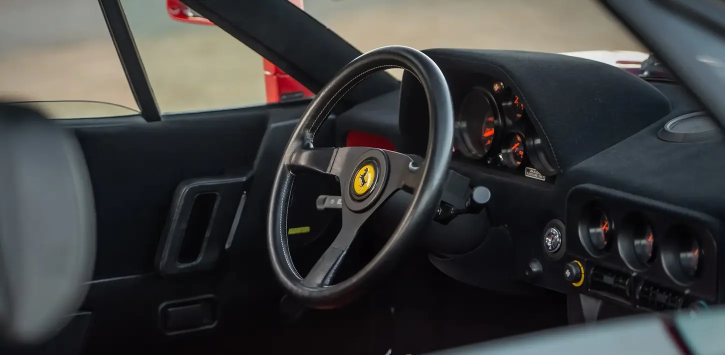 The example on offer, chassis 56773, is one of the 272 Ferrari 288 GTOs built from 1984 to 1985. It left the factory on 3 May 1985, finished in Rosso Corsa, with the cabin upholstered in black leather; its “Daytona”-style seats featured optional red cloth inserts. Destined for the United States, chassis 56773 was equipped with air-conditioning and power windows but without a radio, a nod to the racing DNA of the model.