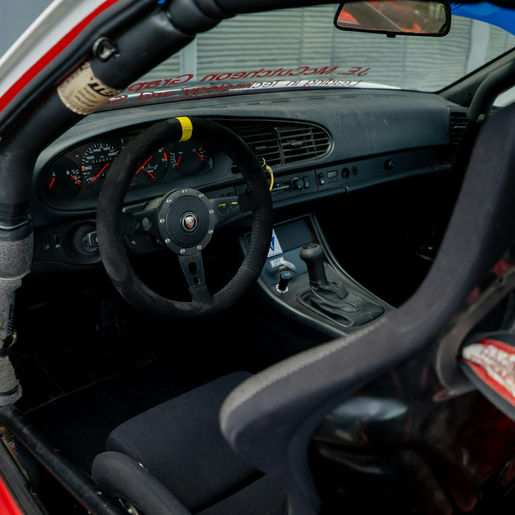 The interior is acceptable for a race car with the original original cage still intact, the original date-coded Riccaro seat and passenger seat in place, with carpeting in place from the rear seats forward. The carpeting in the rear seating section has been removed. The current steering wheel installed is incorrect, but the nice original Ron Fellows steering wheel comes included with the car. The odometer shows 10,099 km which we believe to be original.