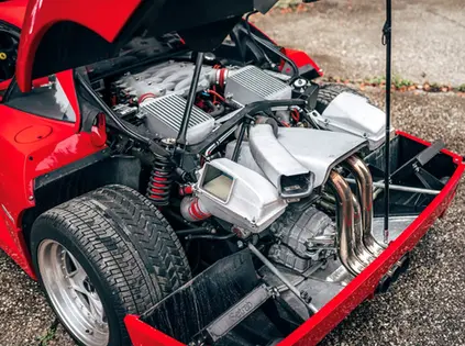 Weight-saving features such as cloth upholstery on plastic-composite racing seats, pull-strap door releases, drilled pedals, and Perspex windows maximised the potential of a new 2.9-litre twin-turbocharged V-8 equipped with IHI turbochargers and Behr intercoolers. European-spec cars developed 478 PS and 577 Nm of torque, the potent Tipo F120A engine was capable of launching the F40 to 100 km/h from standstill in just 4.1 seconds and achieving a top speed of 324 km/h. Initially earmarked for a relatively low production run of 400 cars, the popular F40 was ultimately built in a quantity of 1,315 examples, and the model today remains one of Maranello’s most iconic creations, appealing to supercar enthusiasts and Ferrari purists alike.