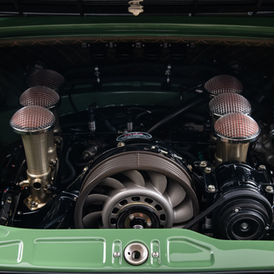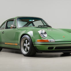 As a result of each Singer being built to specification, collectors were faced with nearly endless customization opportunities that resulted in some truly unique and beautiful examples, such as the 'Lyon' commission offered here. Finished in Leaf Green with Nato Green side stripes, Nato Green brake calipers, and Fuchs-style wheels featuring RSR-style Nato Green backgrounds, this Singer's detailed specification compliments many of the subtle changes Singer has made to the now largely carbon fiber body. The center fuel filler option and painted body-color bumperettes pair well with the subtle hints of color from the SR Orange accents and Brass deck lid badges to finish off this attractive exterior. The interior features desirable 8-way touring Recaro seats featuring Saddle leather contrasting well with the special wishes body-colored 'Jacuzzi' tunnel and footwells. Further options include air conditioning and a special wishes Maple/Mahogany wood gear selector. Following the custom nature of the vehicle, contrasting SR Orange stitching and dash gauge dial details compliment the exterior accents.