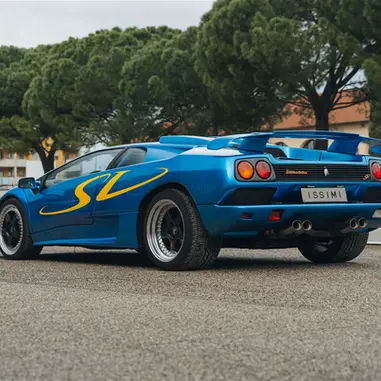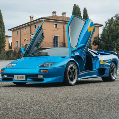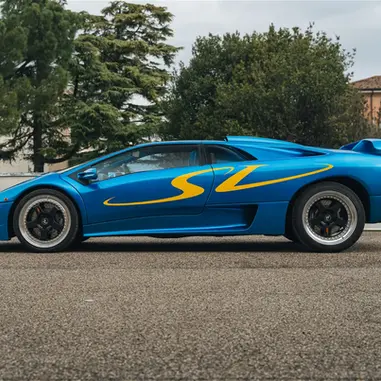 This 1998 Lamborghini Diablo SV is finished in the unique color scheme of Paris Blue over a light blue leather interior and shows 70,514 km at the time of cataloging. This Diablo was delivered new in October of 1998 at the Lamborghini factory in Sant Agata Bolognese and comes with its original stamped service booklet. The yellow “SV” graphics down the side of the car immediately tip you off to what variant of Diablo this is. Still, the discerning enthusiast will also be able to pick up on a few other visual cues. The twin roof scoops emerging from the engine bay and the front fender top vents are both elements taken from the ultra-limited SE30 but are done differently on the SV. Additionally, a unique set of OZ Racing 5-spoke multi-piece wheels with black centers are an SV signature item. This car is from the Diablo’s first facelift, where Lamborghini swapped out the pop-up headlamps for a set of fixed glass lenses that improved lighting and aerodynamics while driving at night. The visual impact of this car in its bright blue with the scrawled SV graphic along the side makes it, without a doubt one of the most attention-grabbing cars on the road, even 25 years after its production.