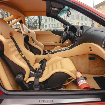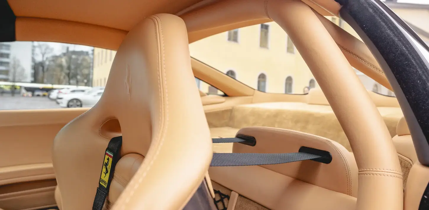 Configured from the factory with the WSR-specification Fiorano handling pack, carbon bucket seats, four-point harnesses, and leather-trimmed roll cage