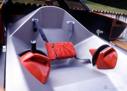 The passenger compartment consisted of a tetragonal capsule, in which the steering wheel, with no steering column, was replaced by two synchronous flywheels located on the arm rests, offering a more ergonomic drive. The driver entered the car by sliding back part of the roof and lifting the windscreen. In addition, the car was transformed into a ‘barchetta’ by removing the mobile part. As regards the safety belt, the driver had a four-point seat belt incorporating an abdominal airbag which expanded outwards and one in the front seat cushion to reduce the impact of the chest on the knees.
